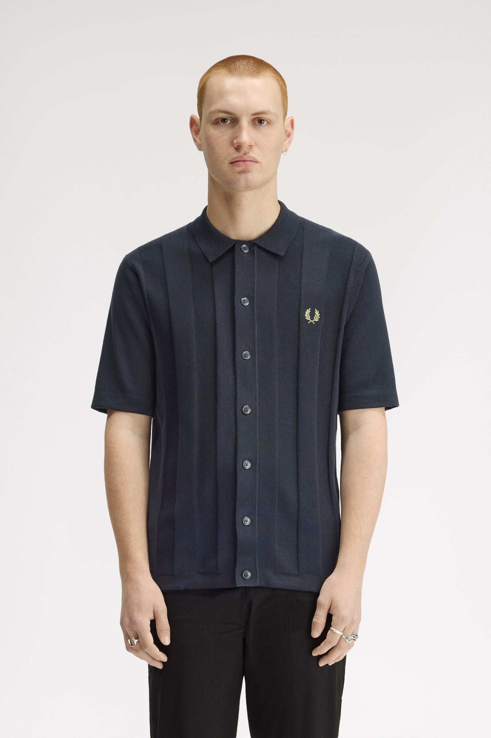 Combed cotton knit / Regular fit / Striped knit at front / Mock horn button fastening / Embroidered Laurel Wreath at chest