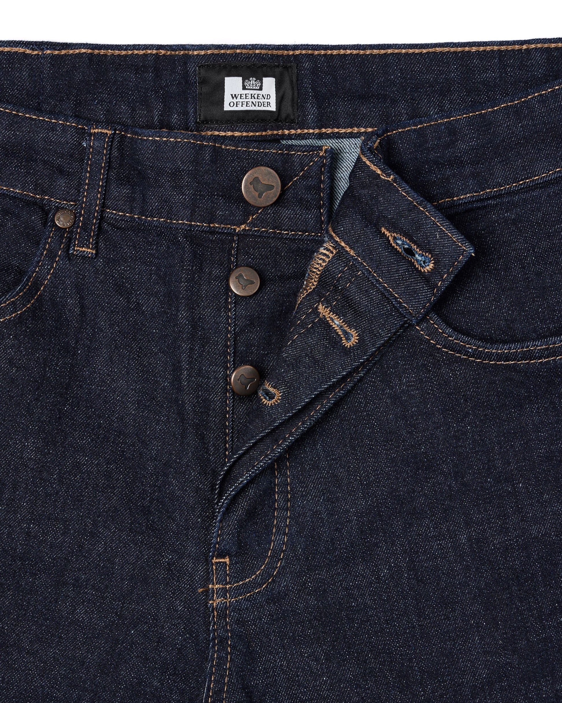 High quality denim spun, dyed and woven in the famous ISKO denim mill. Carefully constructed with durable thread and reinforced with WO metal hardware.